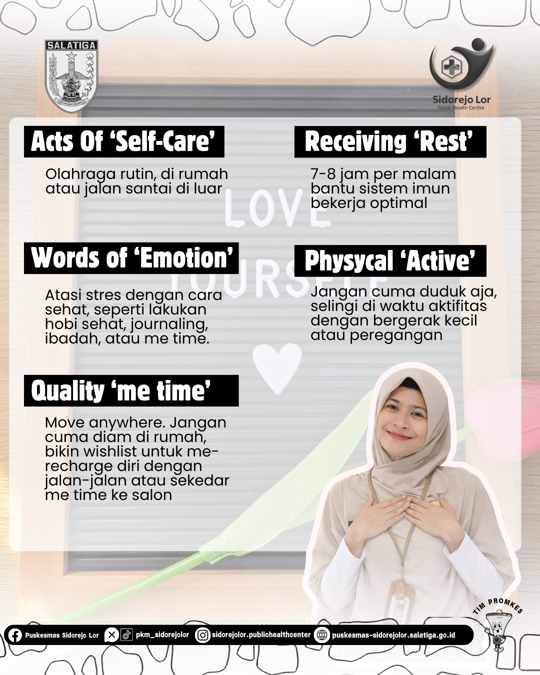 Kesehatan badan dan mental saling berkaitan. Ketika tubuh sehat, pikiran lebih jernih. Ketika mental terjaga, tubuh pun lebih kuat. Mulailah dari langkah kecil dan lakukan secara konsisten. Karena pada akhirnya, mencintai diri sendiri adalah fondasi utama untuk hidup yang lebih sehat, mandiri, dan produktif. 💛