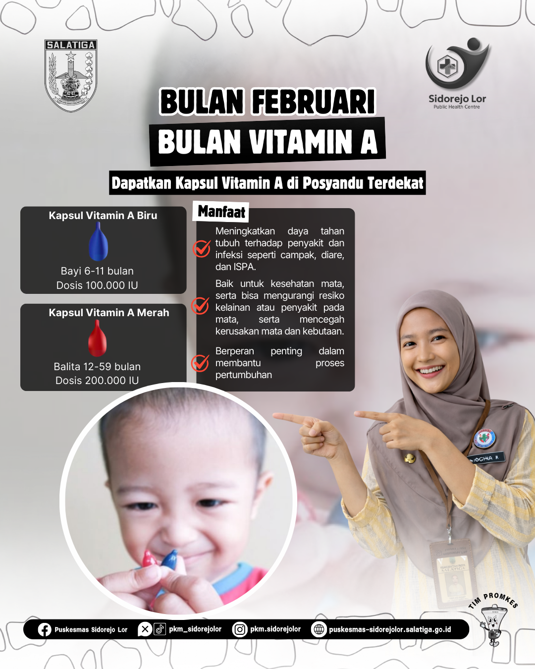 Setiap bulan Februari dan Agustus diperingati sebagai Bulan Pemberian Vitamin A, sebuah program nasional yang bertujuan untuk meningkatkan status kesehatan anak, khususnya bayi dan balita. Vitamin A memiliki peran penting dalam menjaga kesehatan mata, meningkatkan daya tahan tubuh, serta mendukung tumbuh kembang anak secara optimal. Kekurangan vitamin A dapat meningkatkan risiko infeksi dan gangguan penglihatan, sehingga pemberiannya menjadi langkah pencegahan yang sangat penting.