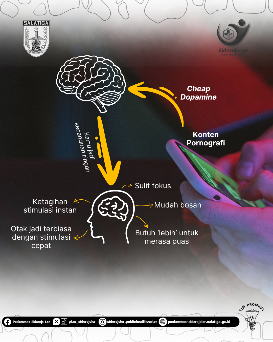 Saat seseorang mengonsumsi konten pornografi, otak akan melepaskan zat kimia bernama dopamin, yaitu zat yang memberikan rasa senang. Jika hal ini terjadi berulang kali, otak akan terbiasa dengan stimulasi cepat dan instan. Akibatnya, seseorang bisa menjadi lebih mudah bosan, sulit fokus, dan membutuhkan rangsangan yang lebih besar untuk merasakan kepuasan.